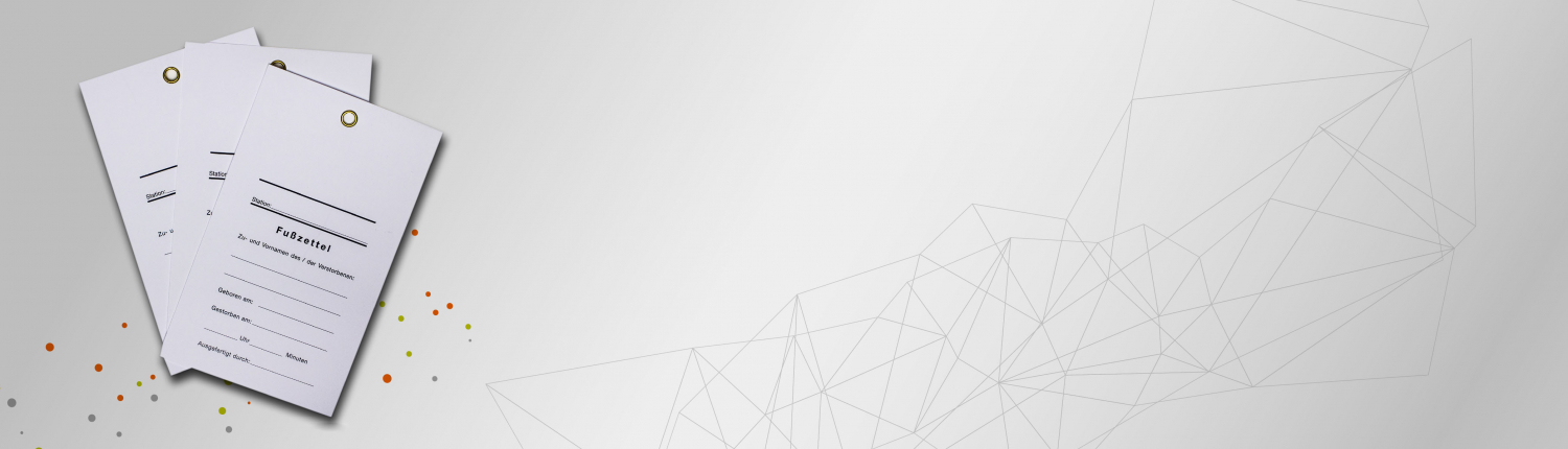 Unsere Fußzettel für Kliniken und Bestattungsunternehmen sind mit einem universellen Aufdruck versehen. Für individuelle Aufdrucke, andere Materialien und Größen stehen wir Ihnen gerne telefonisch unter 05604 / 5077 oder per E-Mail zur Verfügung.
